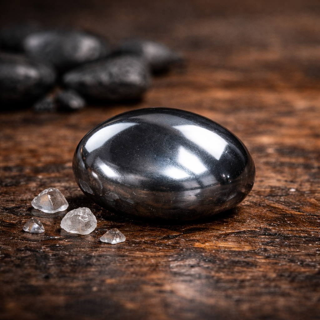 HematitaO que é: pedra de tom grafite/metálico, conhecida pelo brilho elegante e visual moderno.