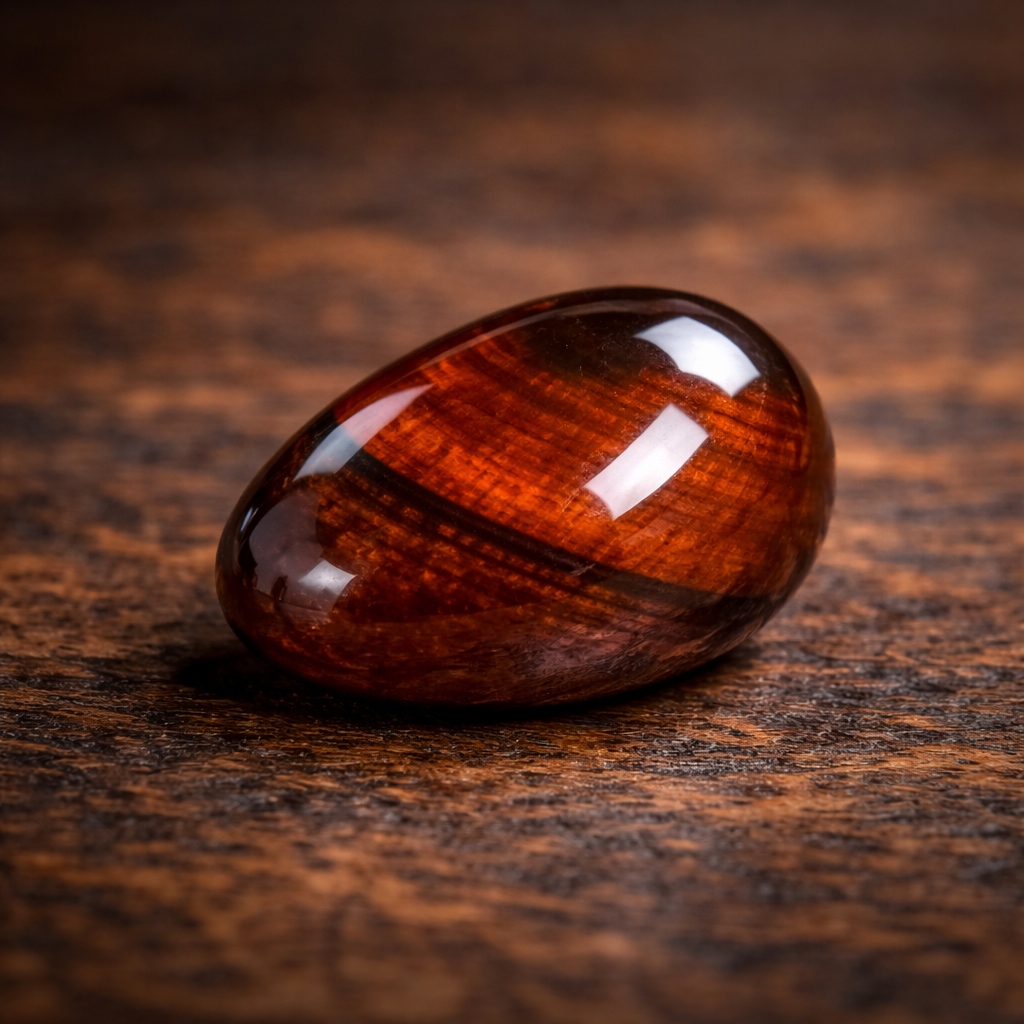 O que é: variação do olho de tigre em tons avermelhados profundos, resultado de um processo térmico natural ou tratado, com o mesmo efeito óptico acetinado (chatoyance), porém com aparência mais intensa e marcante.